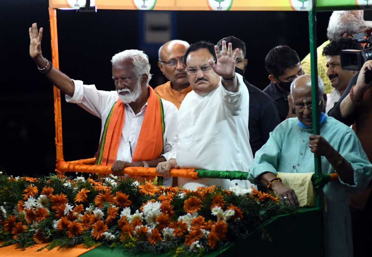 BJP national president J.P. Nadda along with Kummanam Rajasekharan, NDA candidate from Nemom constituency (L) during a roadshow ahead of Kerala assembly polls, in Thiruvananthapuram, Saturday, March 27, 2021. Photo: PTI
