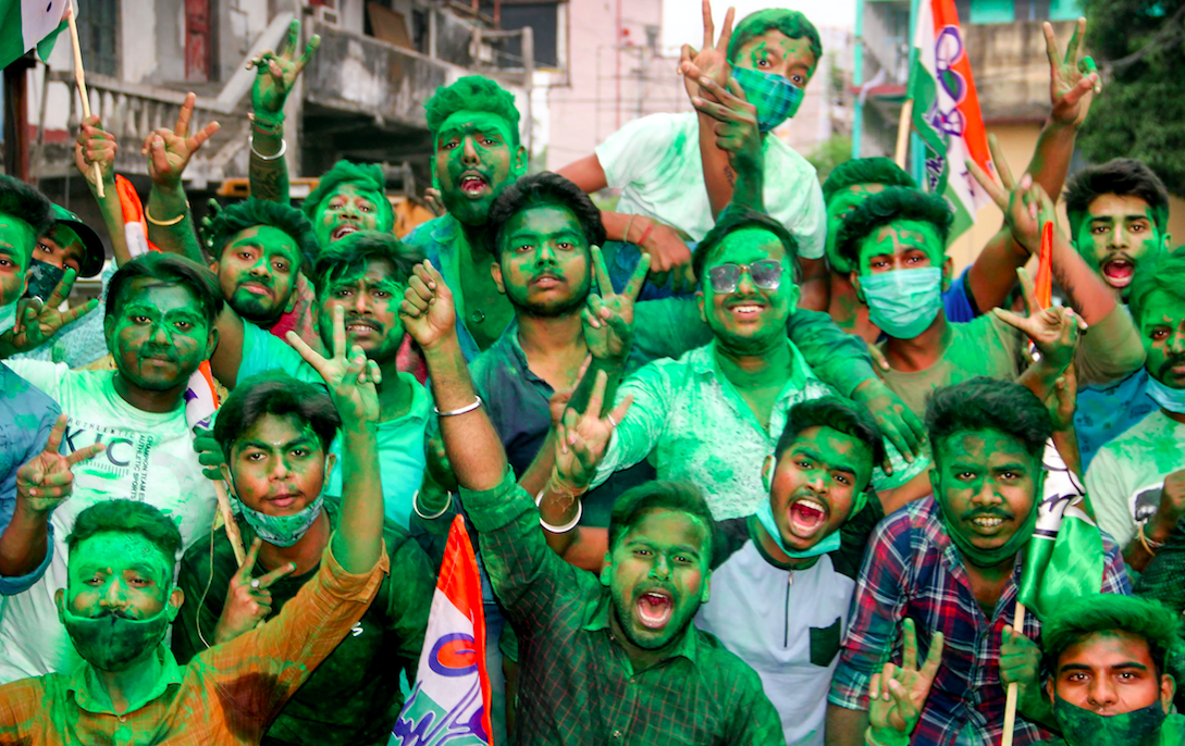Trinamool Congress activists celebrate their partys winning trend during counting day of West Bengal Assembly Election 2021, in South Dinajpur district, Sunday, May 2, 2021. Photo: PTI