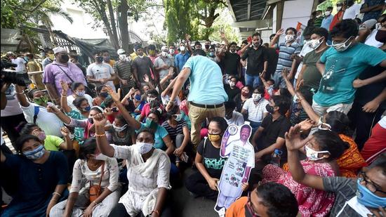 TMC activists shout slogans as they protest outside the CBI office in Nizam Palace, Kolkata, over the arrest of party leaders in connection with the Narada scam case on Monday, May 17. Photo: PTI