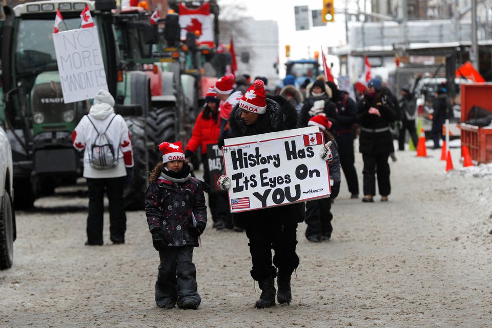 People carry signs, as truckers and supporters continue to protest coronavirus disease (COVID-19) vaccine mandates, in Ottawa, Ontario, Canada, February 6, 2022. REUTERS/Lars Hagberg