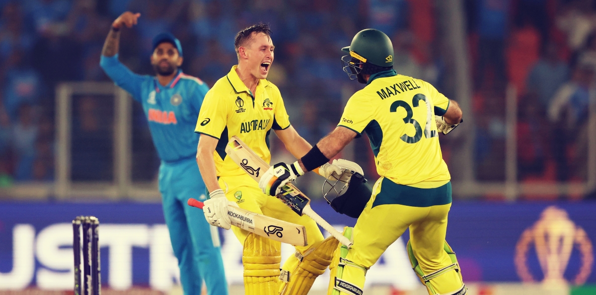 Marnus Labuschagne and Glenn Maxwell celebrate after scoring the winning runs of the Cricket World Cup 2023 final in Ahmedabad, November 19, 2023. Photo: x/@cricketworldcup