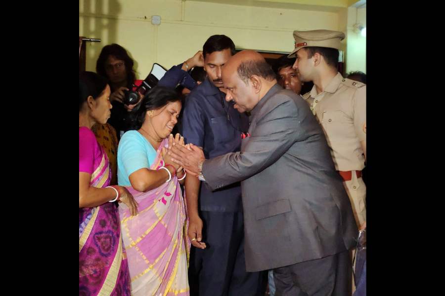 West Bengal Governor C.V. Ananda Bose meets the family members of BJP leader Prasanta Basunia, who was shot dead by unidentified miscreants at his residence, at Dinhata in Cooch Behar district, Saturday, July 1, 2023. Photo: PTI.