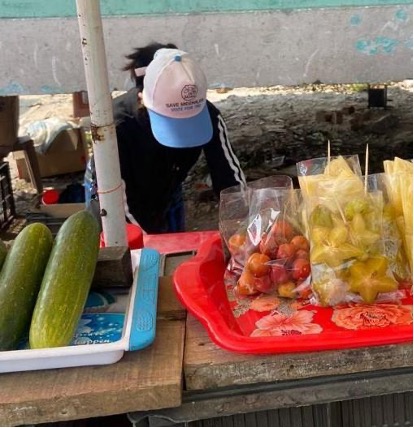A fruit hawker wearing Trinamool cap in the afternoon at Sohra, East Khasi Hills, Meghalaya. Photo: Poulomi Ghosh