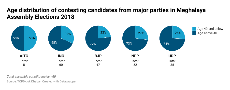 The average age of candidates across major parties is 46 years, with 34% of candidates who are 40 years of age or below. Among parties, the Trinamool Congress distributed the most tickets to 40 and under-40 candidates (38%) , followed by BJP (35%) and NPP (35%). Congress (32%) is only slightly behind and so is UDP (28%), as shown in Figure 1.