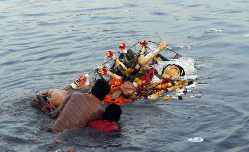 Durga Puja, celebrated in the autumnal month of Ashwin, spans a period of nine days for worshipping the nine avatars of Durga. Originally a goddess of the aboriginal community of Shabars, Durga predates the Vedic goddesses like Aditi, Ushas and Aryani. In many respects she violates the later ideal Hindu goddess: submissive, supportive of and subordinated to a powerful male deity. Her images worshipped during the Navratri or Kali Pooja are hardly maternal in the traditional sense. True, in temples and pandals we see the many-armed Ma with her children Ganesh, Kartikeya, Lakshmi and Saraswati. But they are adoptive, not her genetic children. Maternity is secondary to her. She is a fighter, a yoddha. The male gods are subservient to her in the battle against Mahishasur, and have armed her with their own weapons.