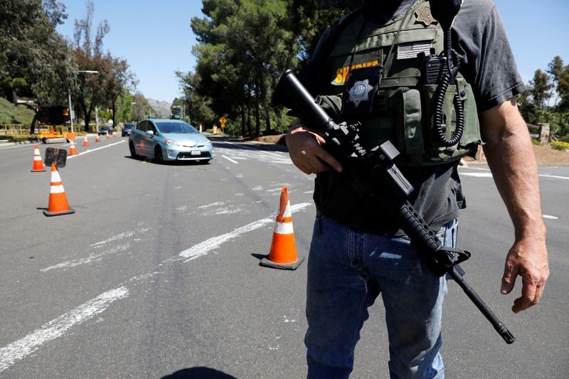 A San Diego Sheriff’s Deputy walks near the scene of a shooting incident at the Congregation Chabad synagogue in Poway, north of San Diego, California, US April 27, 2019. Credit: Reuters