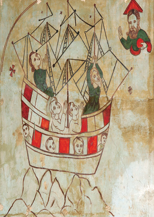 Stylistically, the murals are a fascinating hybrid. Vibrant reds and greens fill bold, black outlines, echoing the aesthetics of Indian folk painting, as seen in the charmingly direct depiction of Noah’s Ark. Yet this is blended with a distinct West Asian aesthetic of the 12th and 13th century, inherited from the Syriac tradition. The figures are often rigid and frontal, with large, wide-open, almond-shaped eyes that gaze into a timeless, sacred space. Christian works of art often reflect doctrinal debates. In the Cheppad murals, certain prominent Nestorian beliefs are clearly evident, such as the depiction of Christ’s suffering and His human form alongside His divinity, echoing the doctrine of Christ as both fully man and fully God. Yet, assigning the entire mural to a single tradition is difficult, as its many themes display a blend of influences. This likely points to collaboration or contact between different Christian traditions.