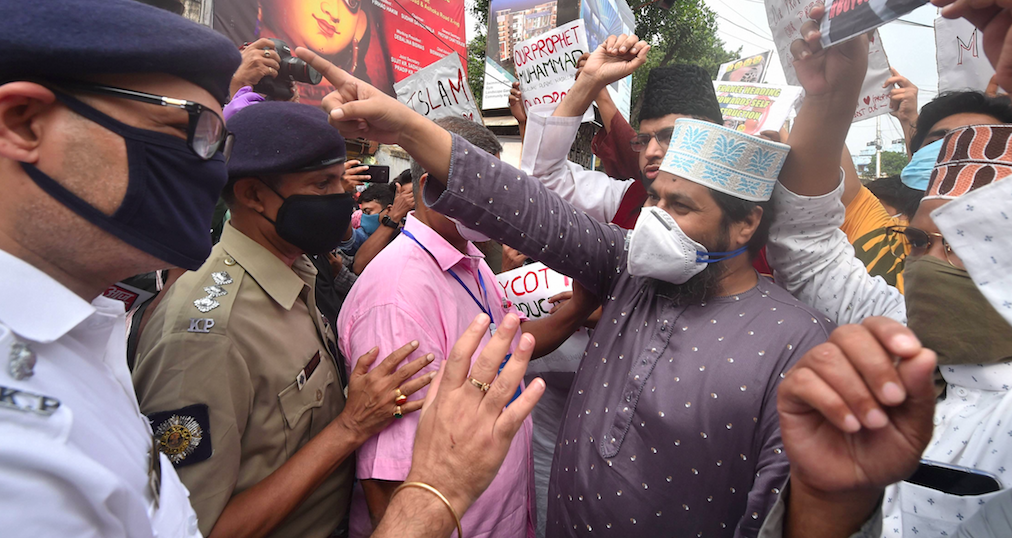 Police speak to Muslims protesting against Macron's words at the French Consulate at Kolkata. Photo: PTI