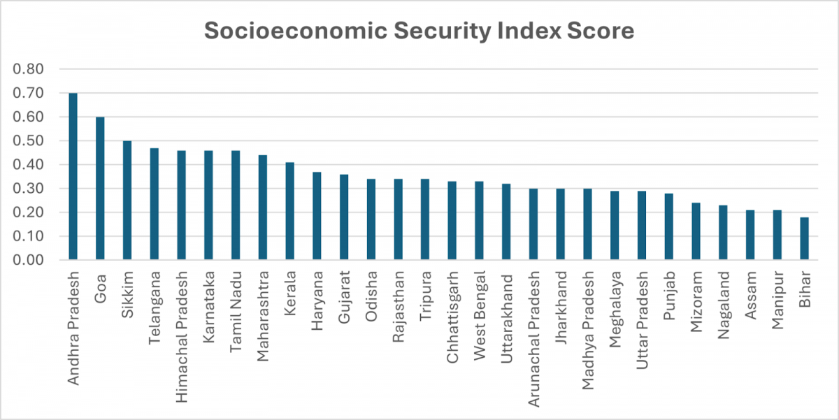 Figure D shows the ranking of states on the pillar of Socio economic security. Andhra Pradesh performs best with a score of 0.70. The worst performing state is Bihar with a score of 0.18.