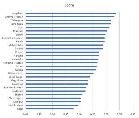 The best performing state in this pillar is Nagaland, which is overall an aspirant state. It has a score of 0.67. The second-best performing state is Andhra Pradesh with a score of 0.66. The worst performing state is Bihar with a score of 0.36, followed by Uttar Pradesh with a score of 0.39.