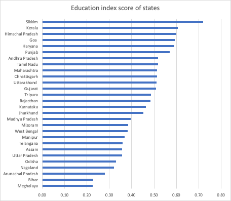 The sub-indicators include net enrolment ratio, net attendance ratio, average annual dropout rate, average household expenditure per child, pupil-teacher ratio, secondary schools at a distance of two kms, availability of toilets for girl, schools offering vocational education, per capita spending by state governments and digital infrastructure such as functional computer and internet facilities.