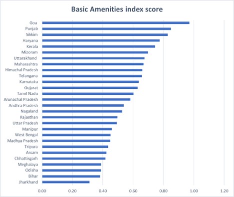 Figure A shows the ranking of states on the pillar of basic amenities. Goa does best with a score of 0.97 with Punjab coming second with a score of 0.85. The worst performing state is Jharkhand with a score of 0.31. The two eastern states Bihar and Odisha are the next worst performers with a score of 0.38 and 0.39 respectively. It is interesting to note that the only other southern state in the top five states is Kerala.