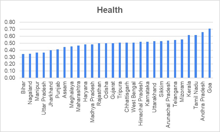 Figure B shows the ranking of states on the pillar of Health. Goa does best with a score of 0.70 with Andhra Pradesh coming second with a score of 0.66. The worst-performing state is Bihar with a score of 0.34.