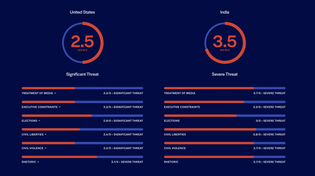 The score from 1 (healthy democracy) to 5 (total dictatorship) compiles ratings from democracy experts across the country and political spectrum on six key metrics – treatment of media, executive constraints, elections, civil liberties, civil violence, and rhetoric.