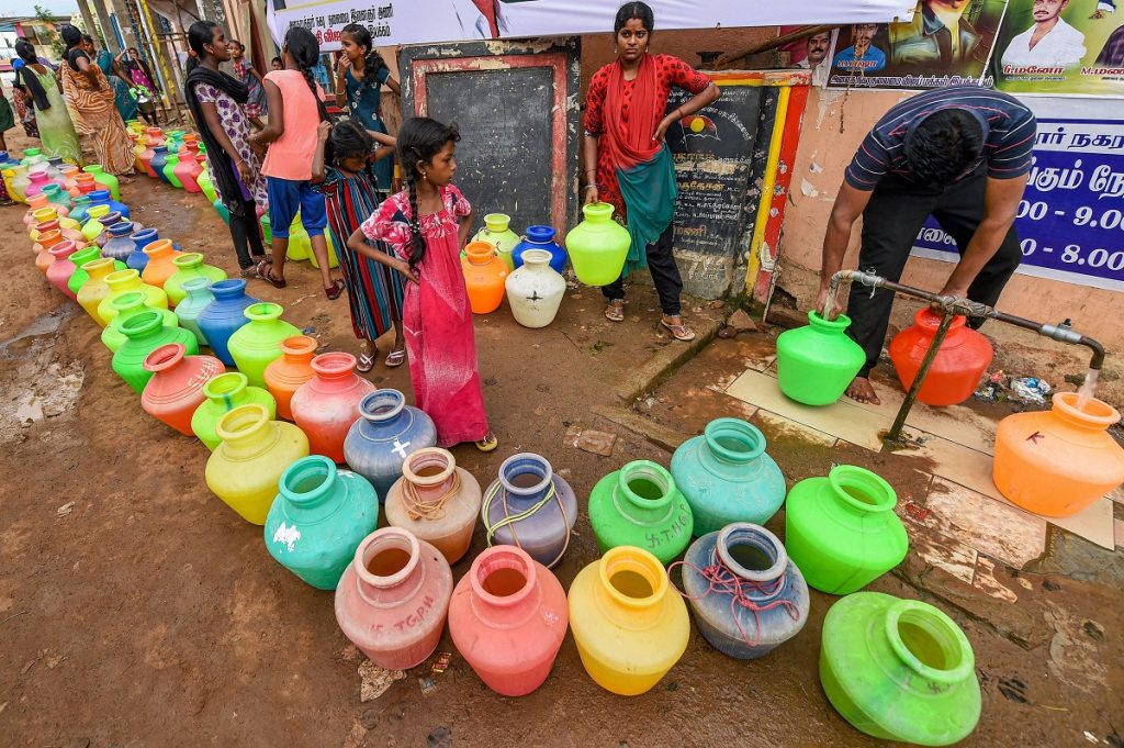 People queue up to fill their vessels following acute water shortage. Photo: PTI