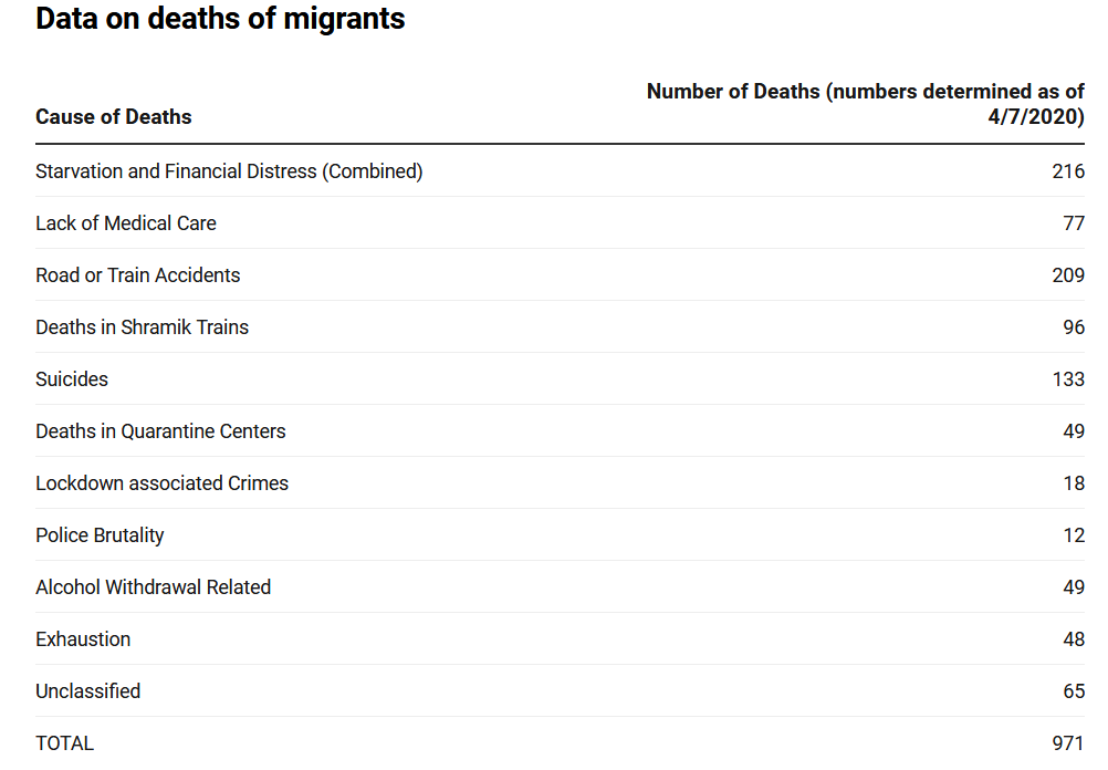 The maximum number of deaths, that is 216, occurred due to starvation and financial crisis. At the same time, 209 migrant labourers died in separate road accidents while they were returning home on foot due to unavailability of public transport during the lockdown.
