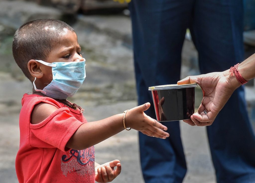 A child collects food from a volunteer, during ongoing COVID-19 lockdown in Kolkata, Monday, May 4, 2020. Photo: PTI