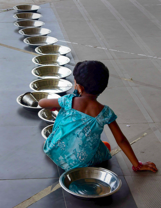 A child sits between a queue of plates ahead of food distribution in Vashi in Navi Mumbai. Photo: PTI