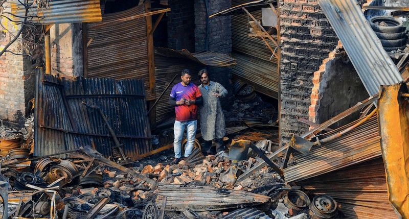 Onlookers at a market burnt by rioters in Gokulpuri area of Northeast Delhi, March 4, 2020. Photo: PTI/ Kamal Kishore