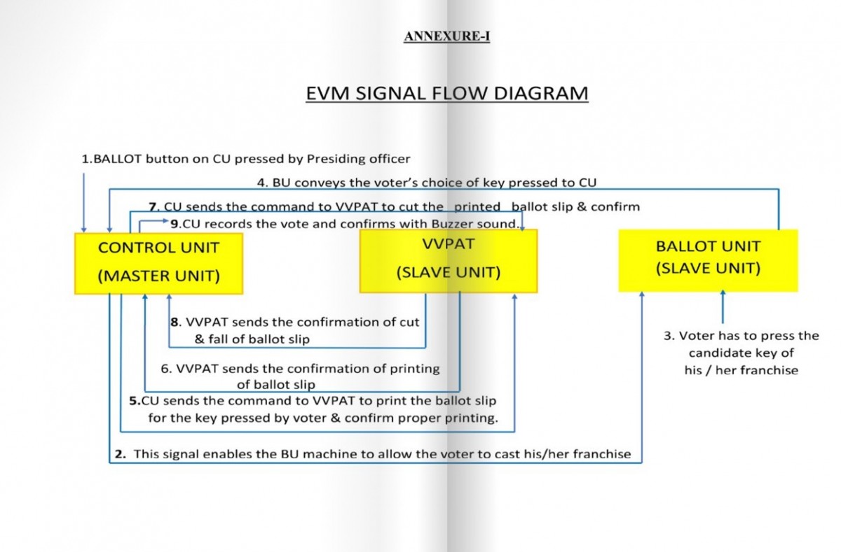It is evident now that disconnecting the Voter Verified Paper Audit Trail (VVPAT) unit from the Control Unit (CU) is not a mere device rearrangement. It will need redesign. And therefore the weakest part of the Electronic Election System (EES) ecosystem and the election process will remain the weakest in the near future. The diagram below clearly shows how the signal flows and that the electronic vote will not reach VVPAT from the Ballot Unit (BU) without first going to the CU, i.e. without the VVPAT- CU connection.