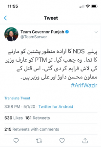 The governor’s verified twitter account posted that “The NDS first intended to kill Manzoor Pashteen (PTM’s top leader). But when he went into hiding, Arif Wazir’s corpse was delivered. (MNAs) Mohsin Dawar and Ali Wazir aided and abetted in this murder”.
