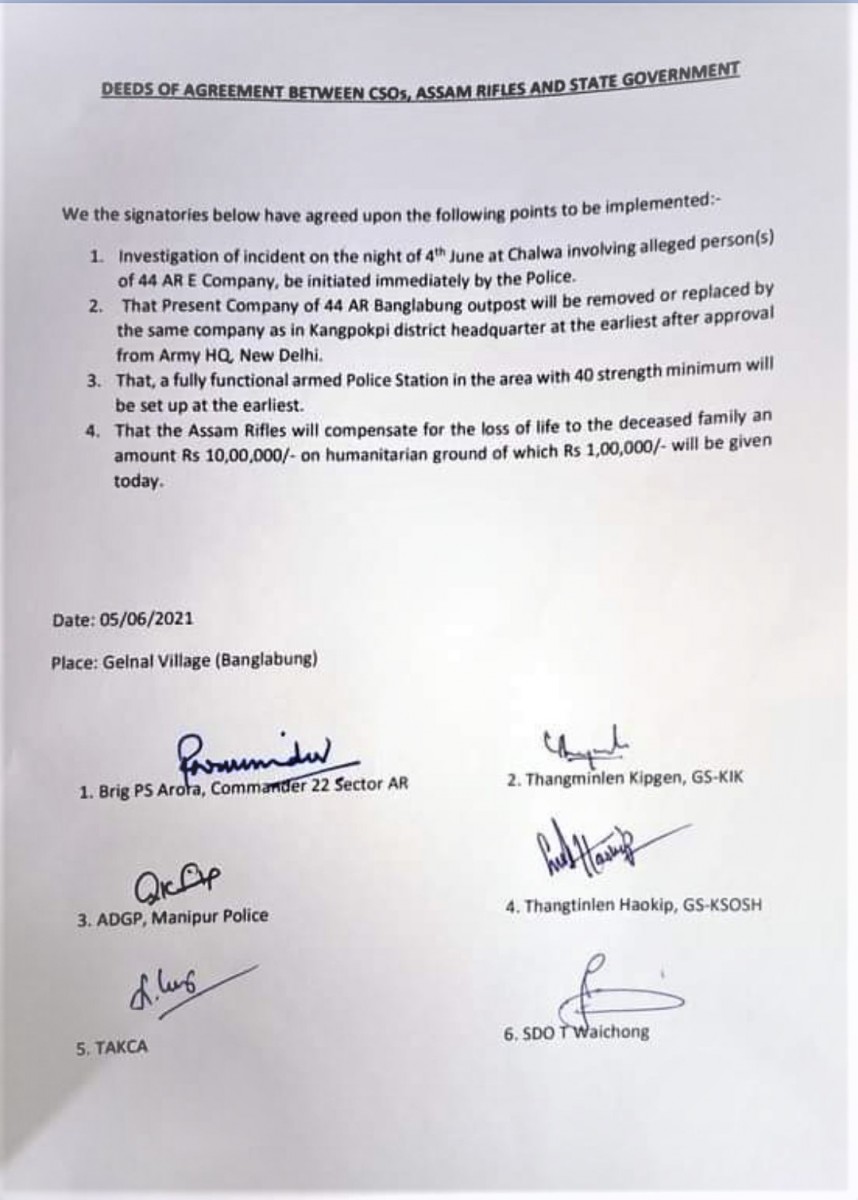 The third point of the agreement stated that the 44 Assam Rifles Bunglabung outpost would be shifted from its present location in Gelnel village to Kangpokpi, the district headquarters, after due approval from army headquarter, New Delhi.