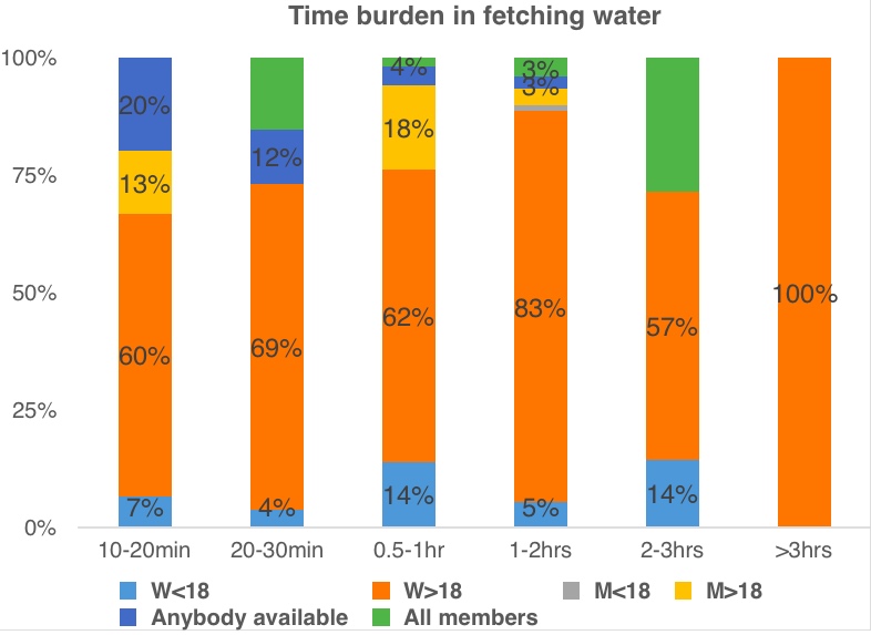 Study findings also reveal that more than half of those who reported difficulty in accessing IHHL, also reported that IHHL has increased the burden of fetching water. Nearly three-fourth respondents disclosed that women and girls were responsible for fetching water. They spend close to one to two hours daily securing water for the entire household.