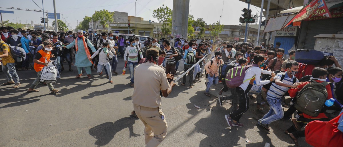 A policeman wields his baton to disperse protesting migrant workers, during the ongoing COVID-19 nationwide lockdown, in Ahmedabad, Sunday,May 17, 2020. The migrants were demanding a means of transport to travel to their native places in Bihar. Photo: PTI