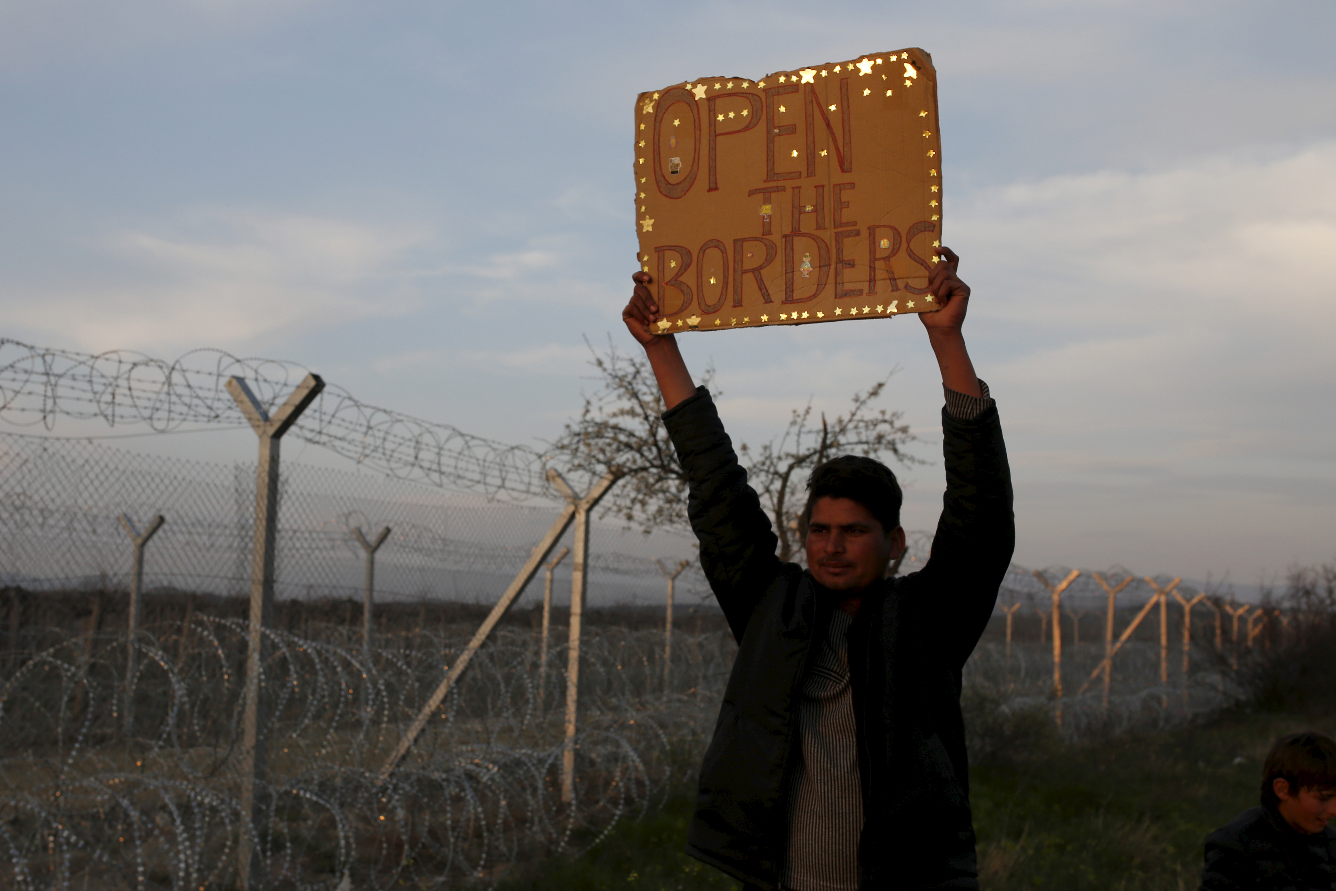 A migrant holds a sign in front of the Greek-Macedonian border fence near the village of Idomeni, Greece, March 28, 2016. Credit: REUTERS/Marko Djurica