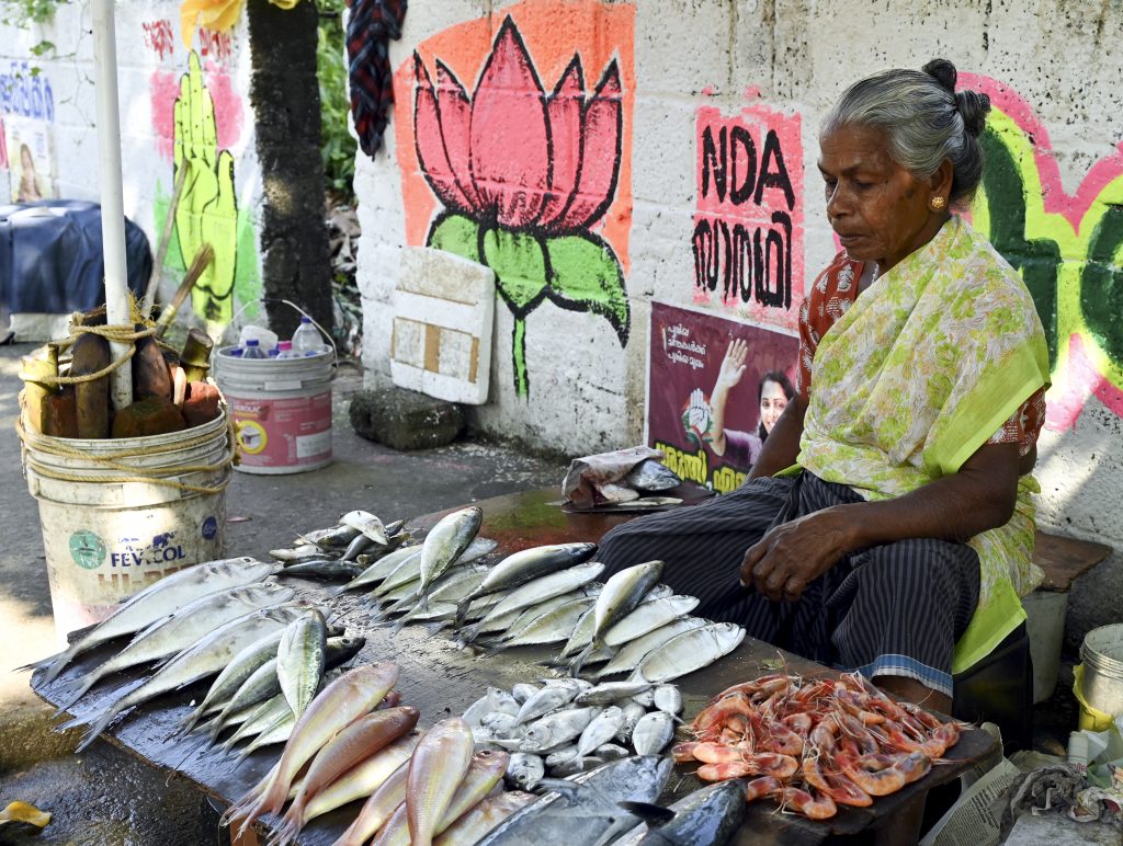 A fish vendor waits for customers with political symbols painted on a wall in the background, ahead of the upcoming Kerala local body elections, in Thiruvananthapuram, Thursday, Nov. 20, 2025. Photo: PTI.