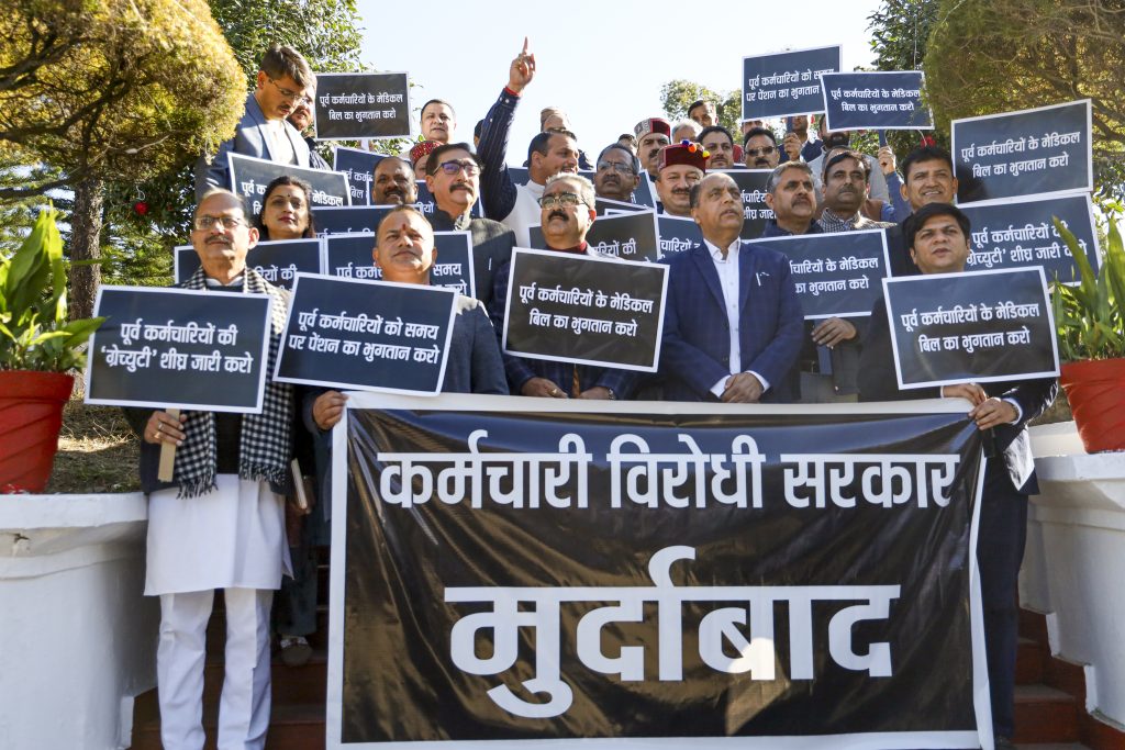 Dharamshala: BJP leaders hold placards during a protest over various demands on the third day of the winter session of the Vidhan Sabha at Tapovan, in Dharamshala, Friday, Nov. 28, 2025. Photo: PTI.