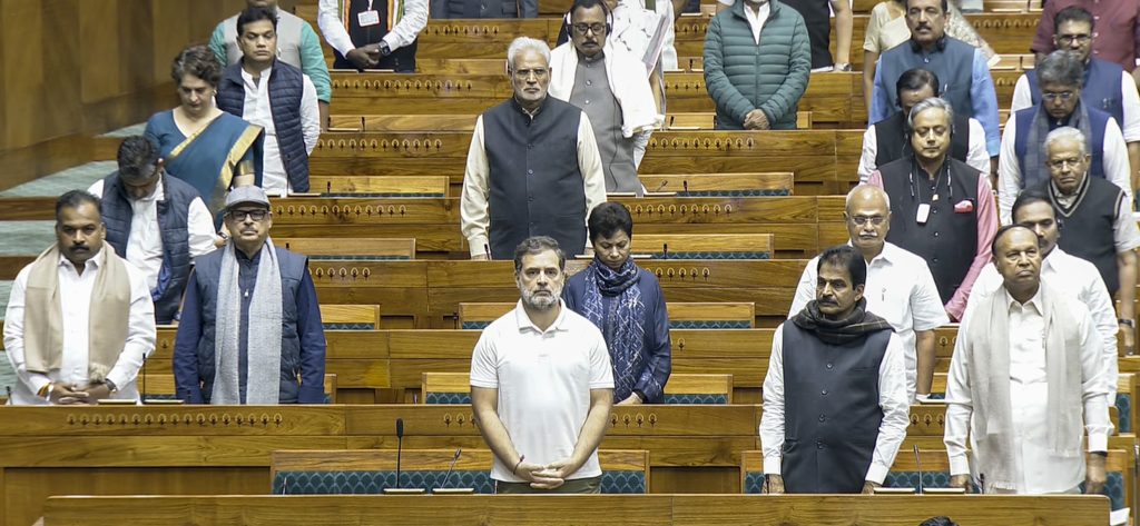 LoP in the Lok Sabha and Congress leader Rahul Gandhi and others during the first day of the Winter Session of Parliament, in New Delhi, Monday, Dec. 1, 2025. Photo: PTI/Sansad TV.