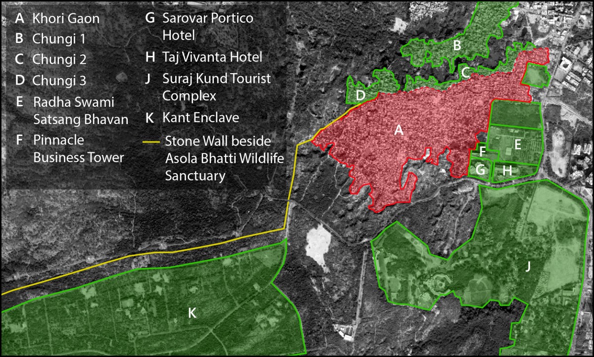 The only territorial marker present is the stone wall built at the edge of the Asola Bhatti wildlife sanctuary to Khori Gaon’s west. Due to the absence of any border marker, the edge between Delhi and Faridabad has been an ambiguous zone. This ambiguity has been exploited by the land mafia, who sold the plots to the residents as well as the politicians.