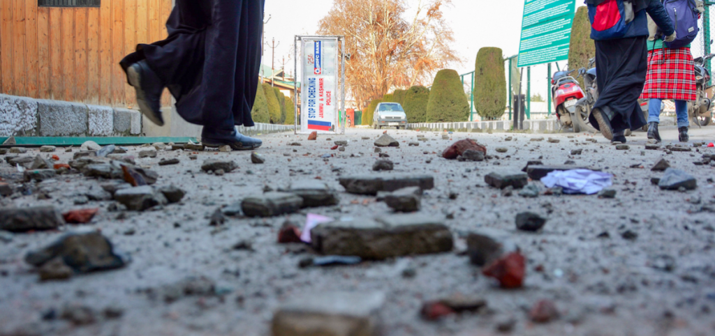 Stones pelted during clashes between students and police during a protest against police atrocity on students of Jamia Millia Islamia University in New Delhi and against the Citizenship Amendment Act (CAA), near Islamia College of Science and Commerce in Srinagar, Tuesday, December 17, 2019. Photo: PTI