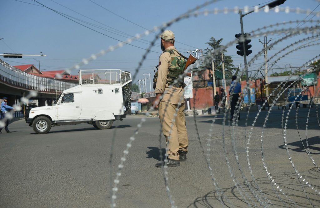 Security personnel stand guard on a street during restrictions imposed in the wake of the first anniversary of Article 370 abrogation, in Srinagar, Wednesday, Aug. 5, 2020. Photo: PTI
