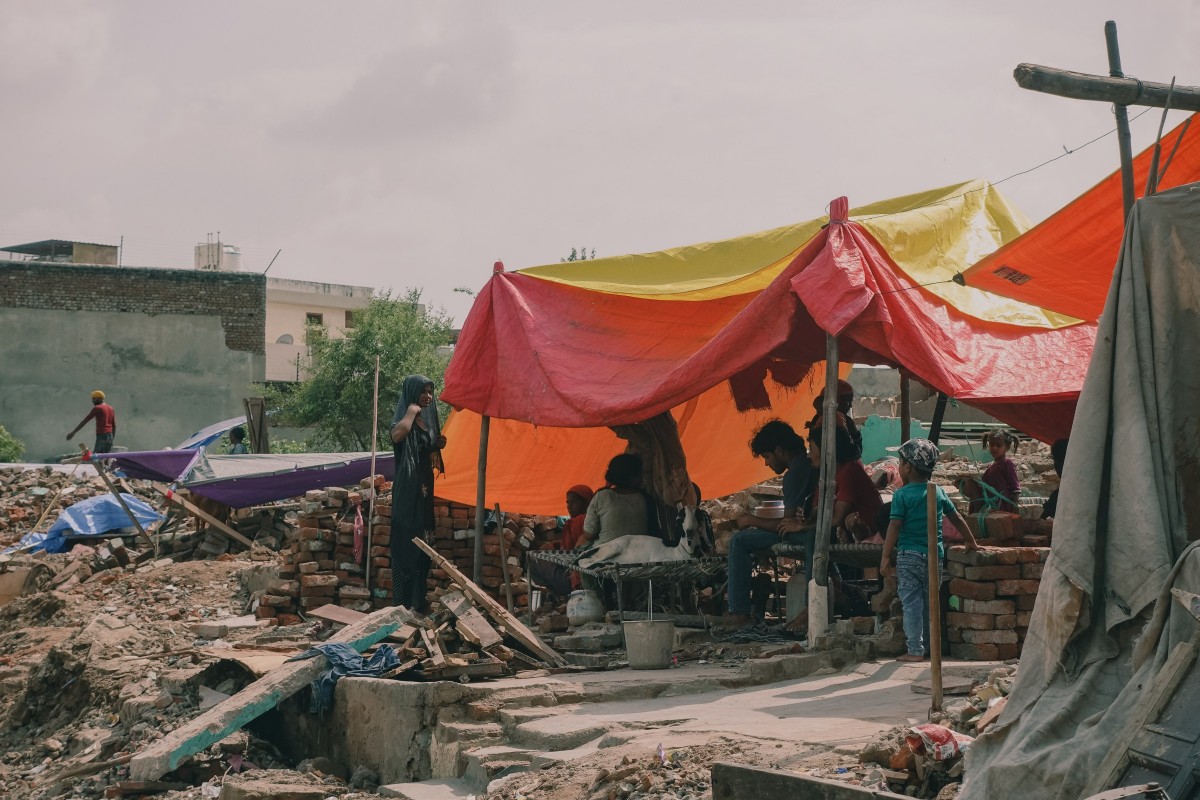 Families in Mathura live under plastic and paper roofs with their children after their houses were demolished. Photo: Atul Howale/The Wire