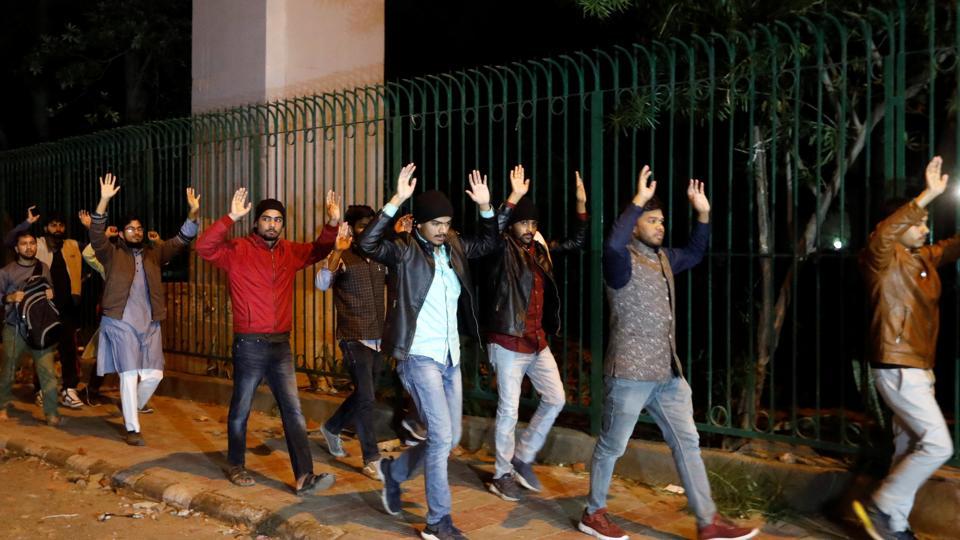 Students raising their hands leave Jamia Milia University following the police's attack on the campus on December 15, 2019. Photo: Reuters