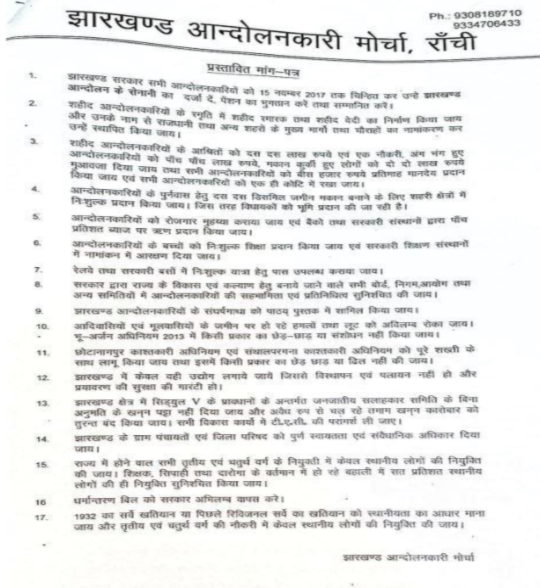 JAM immediately opposed the frame of reference and noted that the struggle was for Jharkhand and not for Vananchal. So, the name of the Ayog should not carry the obliqued word that the JAM said was an attempt by the Rashtriya Swayamsevak Sangh and the Bharatiya Janata Party to take over the movement. JAM also called for removing the categorisation of andolankaris and asked for equal treatment for all.