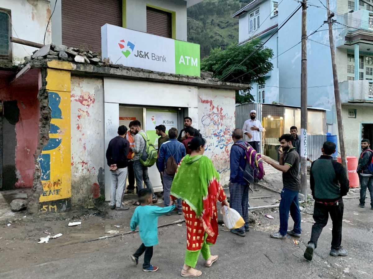 A group of workers employed at the Ratle power project stand in a queue outside an ATM in Drabshalla town of Kishtwar. Photo: Jehangir Ali.