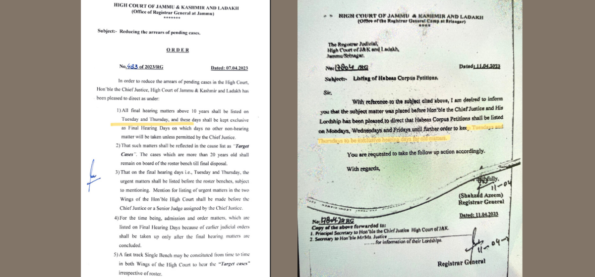 On the right, the JK&L High Court Registrar General's notice which stipulates scheduling the cases “above ten years” on Tuesdays and Thursdays. On the left, the Registrar General's notice confirming that habeas corpus petitions shall be listed on Mondays, Wednesdays and Fridays until further order to keep Tuesdays, Thursdays to be exclusive hearing days for old matters.