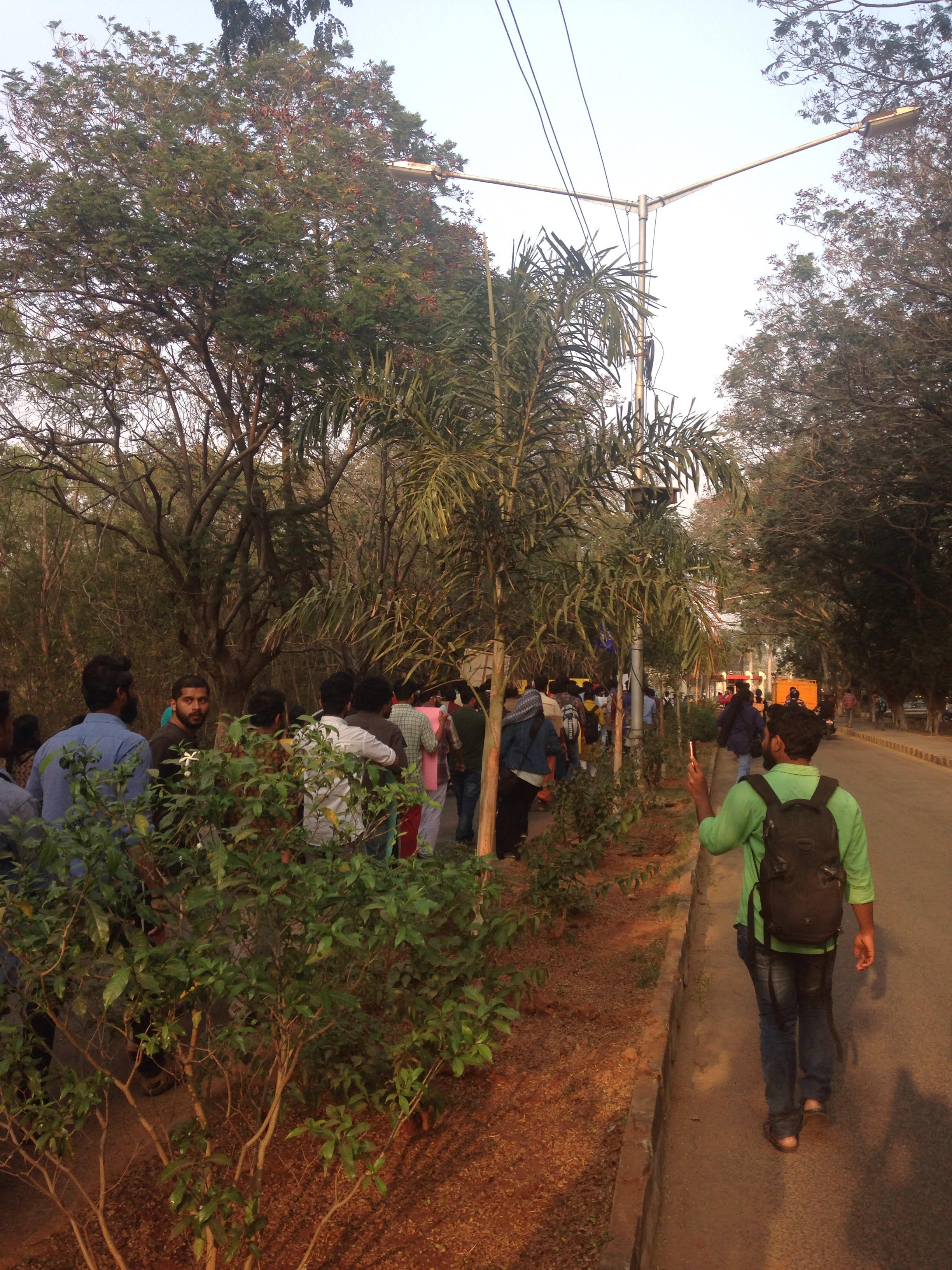 The protest was meant to begin with Vemula's mother, Radhika Vemula, garlanding his statue inside the campus. However, with the vice chancellor issuing a circular the night before that explicitly banned 'outsiders' from entering the campus, students marched to the university gate.
