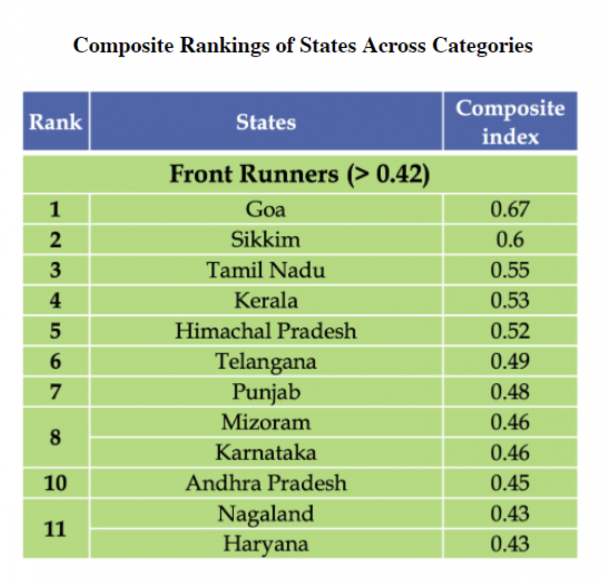 Based on the composite ranking score range of 0.67-0.23, states in our index are grouped into three categories – “aspirants” (below 0.33), “achievers” (0.42-0.33) and “front runners” (above 0.42).