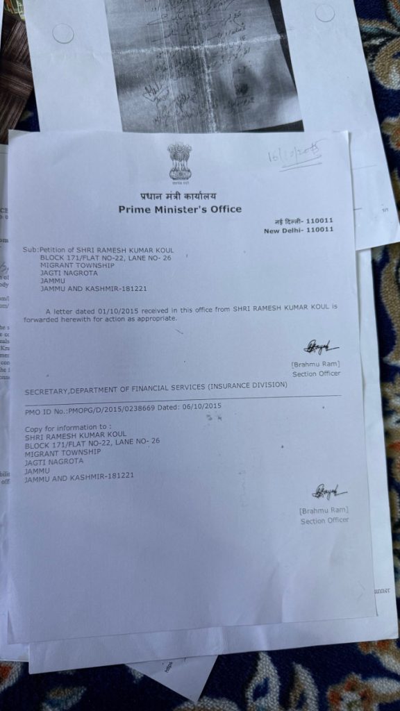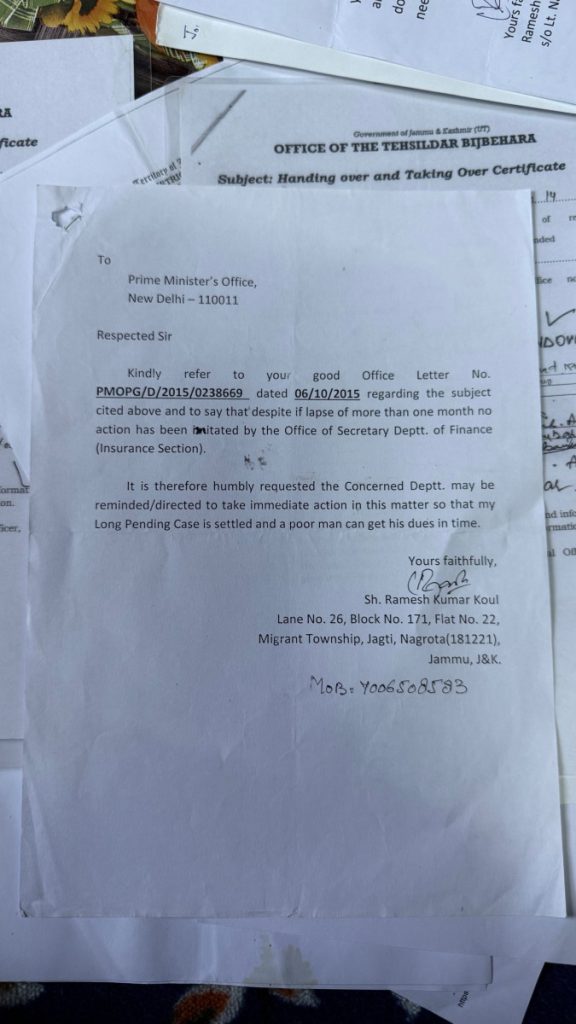 But when it comes to insurance, the earliest of his pleas are from the 2000s; the latest is barely a year old. Each repeats the same requests: restoration of his home, to act on encroachment complaints, to process compensation and update him on the status of his insured property. This bundle of requests and papers concerns the Oriental Insurance Company, the organisation with which Koul insured his home in Laribal.