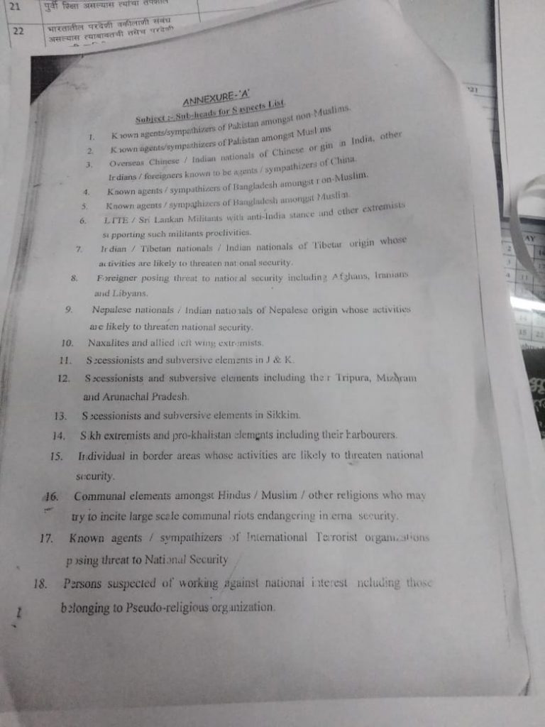 An annexure to the book, accessed by The Wire, lists 18 different categories of “suspects”. Some categories include “known agents/ sympathisers of Pakistan among non-Muslims", "known agents/ sympathisers of Pakistan among Muslims”, “LTTE/ Sri Lankan militants”, “Naxalites and allied left-wing extremists”, “communal elements amongst Hindus/ Muslims”.