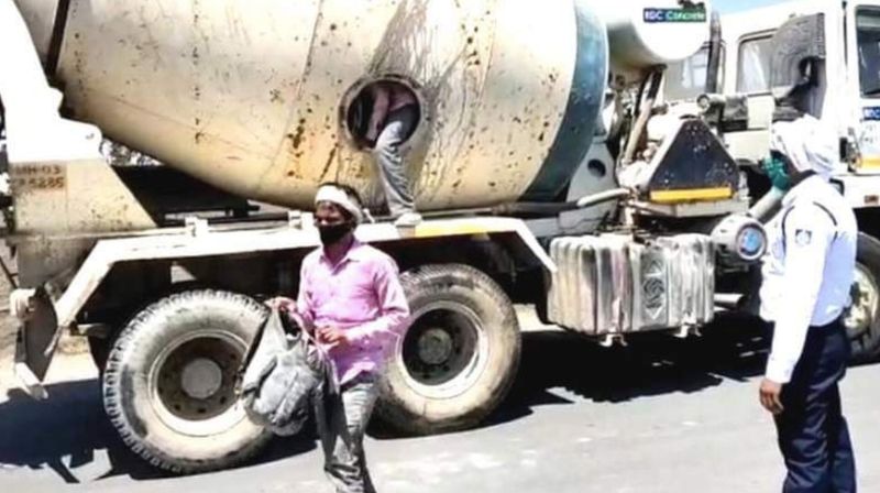 Migrant workers crammed in cement mixer truck caught by Indore police. Truck was heading to Uttar Pradesh from Maharashta. pic.twitter.com/NsJBiXPis3