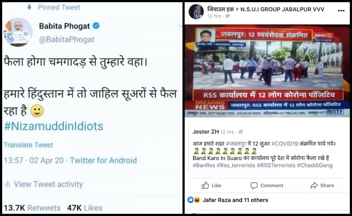 (Left) Screenshot of Babita Phogat's tweet from April 2, 2020, now deleted: 'Bats may have spread it in your country. In India it is being spread by ignorant pigs. #NizamuddinIdiots". (Right) Ziya-ul-Haq's Facebook post of July 19, 2020: "12 pigs have been tested corona positive in our city today. Close the offices of these pigs, they are spreading corona across the country."
