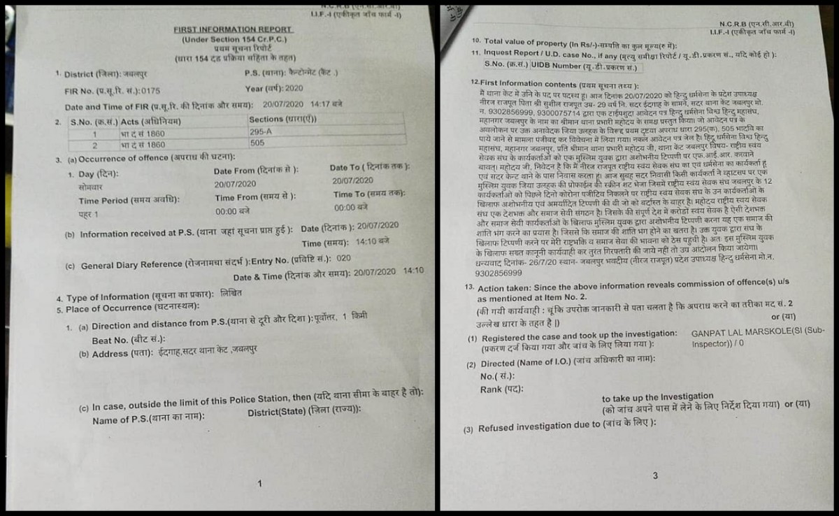 FIR filed by the Jabalpur police against Ziya-ul-Haq on July 20, 2020.