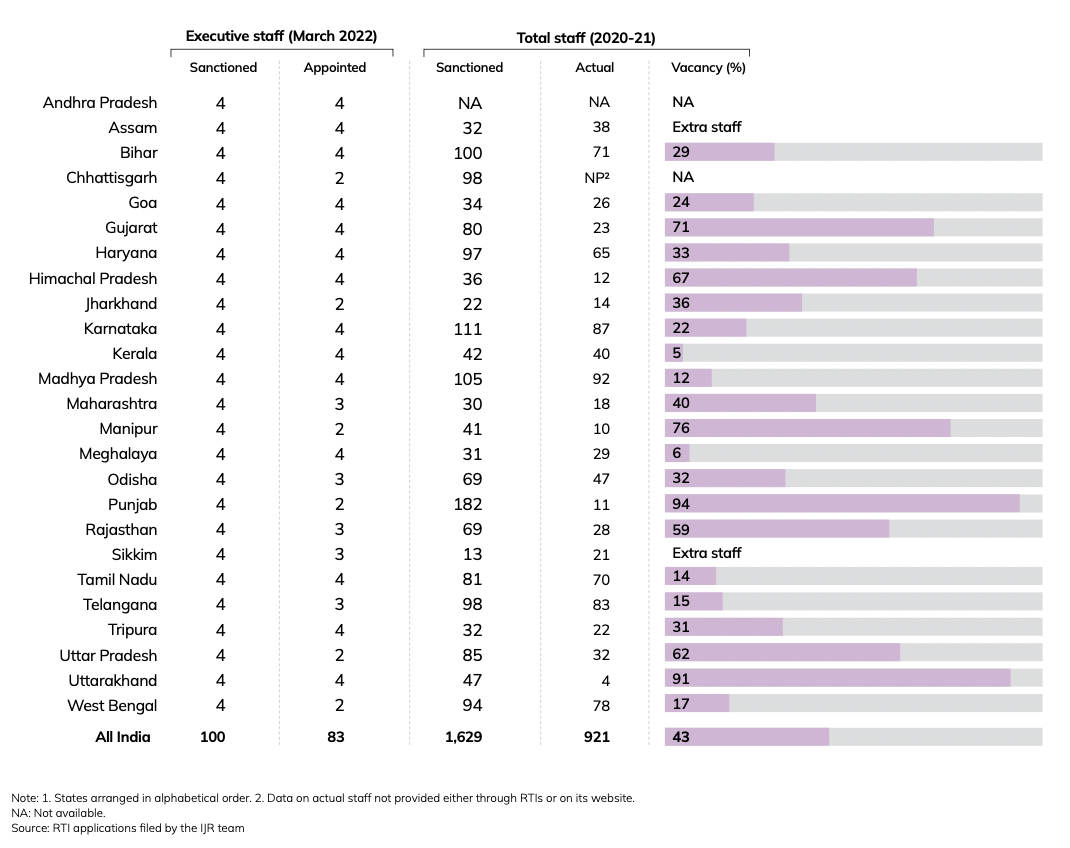 While the mandate of SHRCs sounds well and good on paper, the IJR has found that most SHRCs are functioning at well below the required manpower. In 2020-21, 13 states had more than 25% vacancies in SHRC staff.