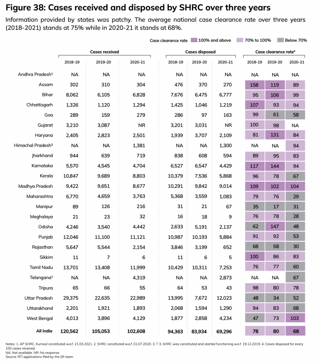 Because of these longstanding vacancies and the lack of investigative staff, complaints are rarely disposed off in a timely manner in SHRCs, the report finds. "In 2020-21 alone complaints across all SHRCs stood at 1,02,608. Eight SHRCs disposed of less than 60 per cent of complaints received, with Meghalaya (28 per cent) clearing the least, followed by Maharashtra (29 per cent), Rajasthan (30 per cent) and Odisha (48 per cent). Bihar (99 per cent) and Chhattisgarh (94 per cent) cleared almost all the cases they received. Cumulative arrears at the end of 2020-21 stood at 33,312."