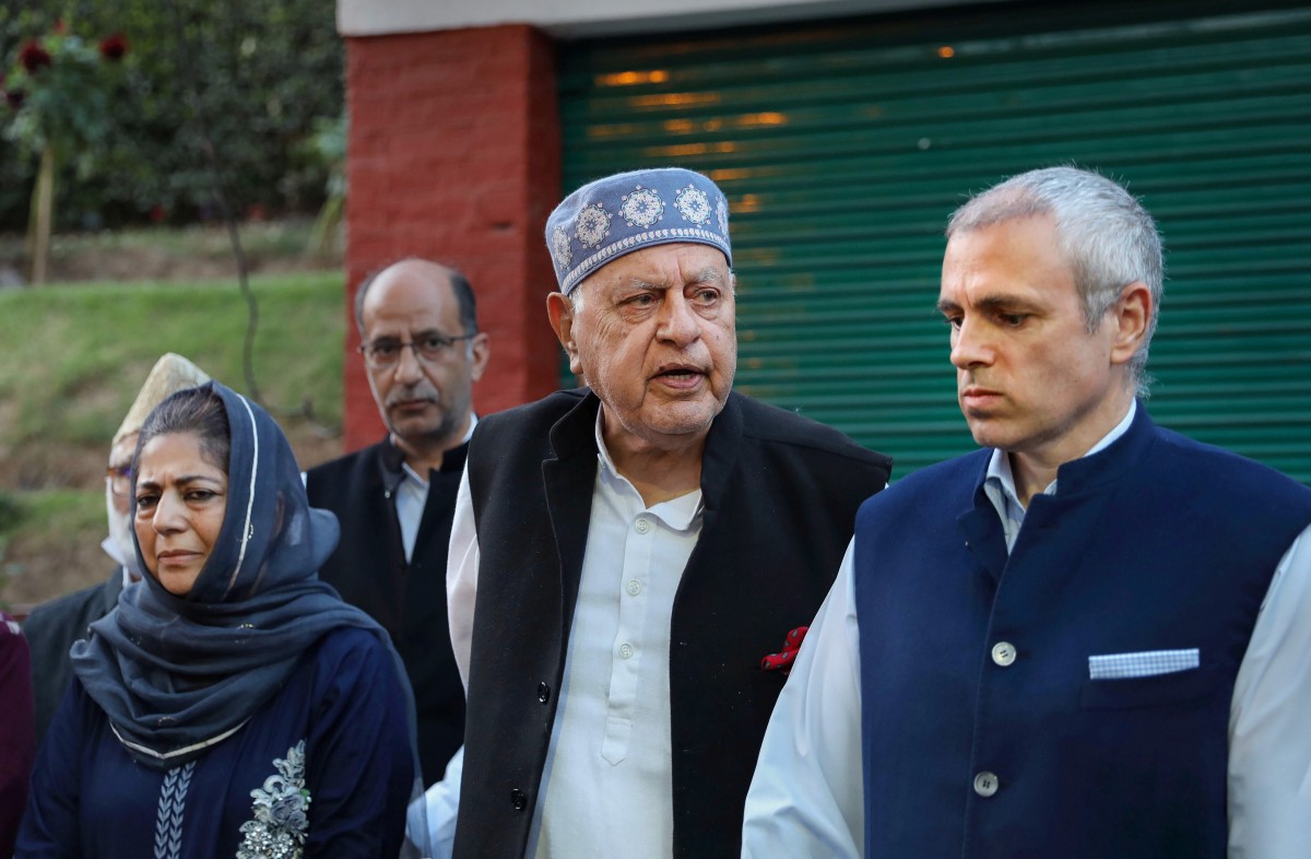 Jammu and Kashmir National Conference President Farooq Abdullah addresses a press conference along with his son Omar Abdullah, Peoples Democratic Party (PDP) President Mehbooba Mufti and others after meeting of signatories to the Gupkar declaration, at his residence in Srinagar, Thursday, October 15, 2020. Photo: PTI